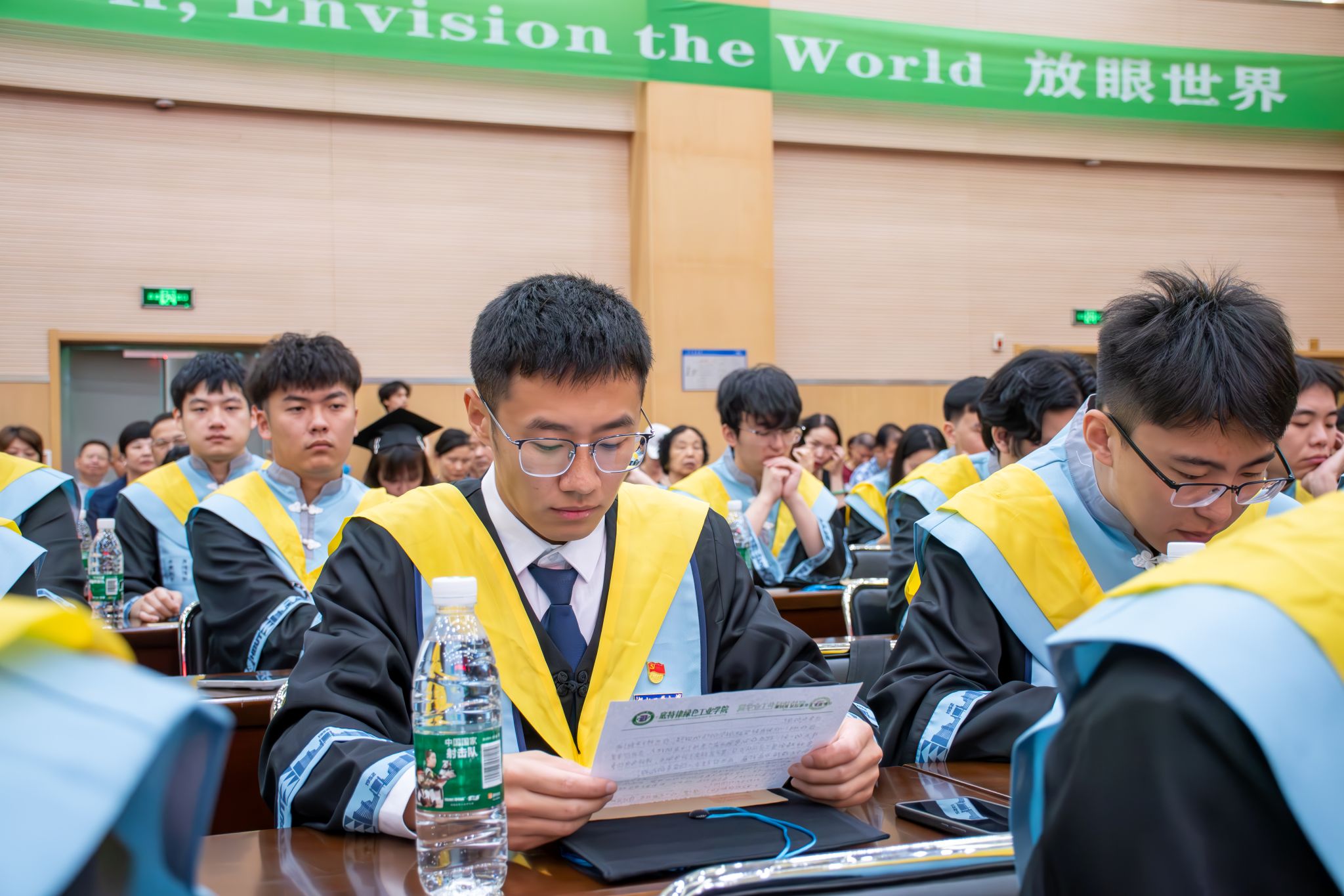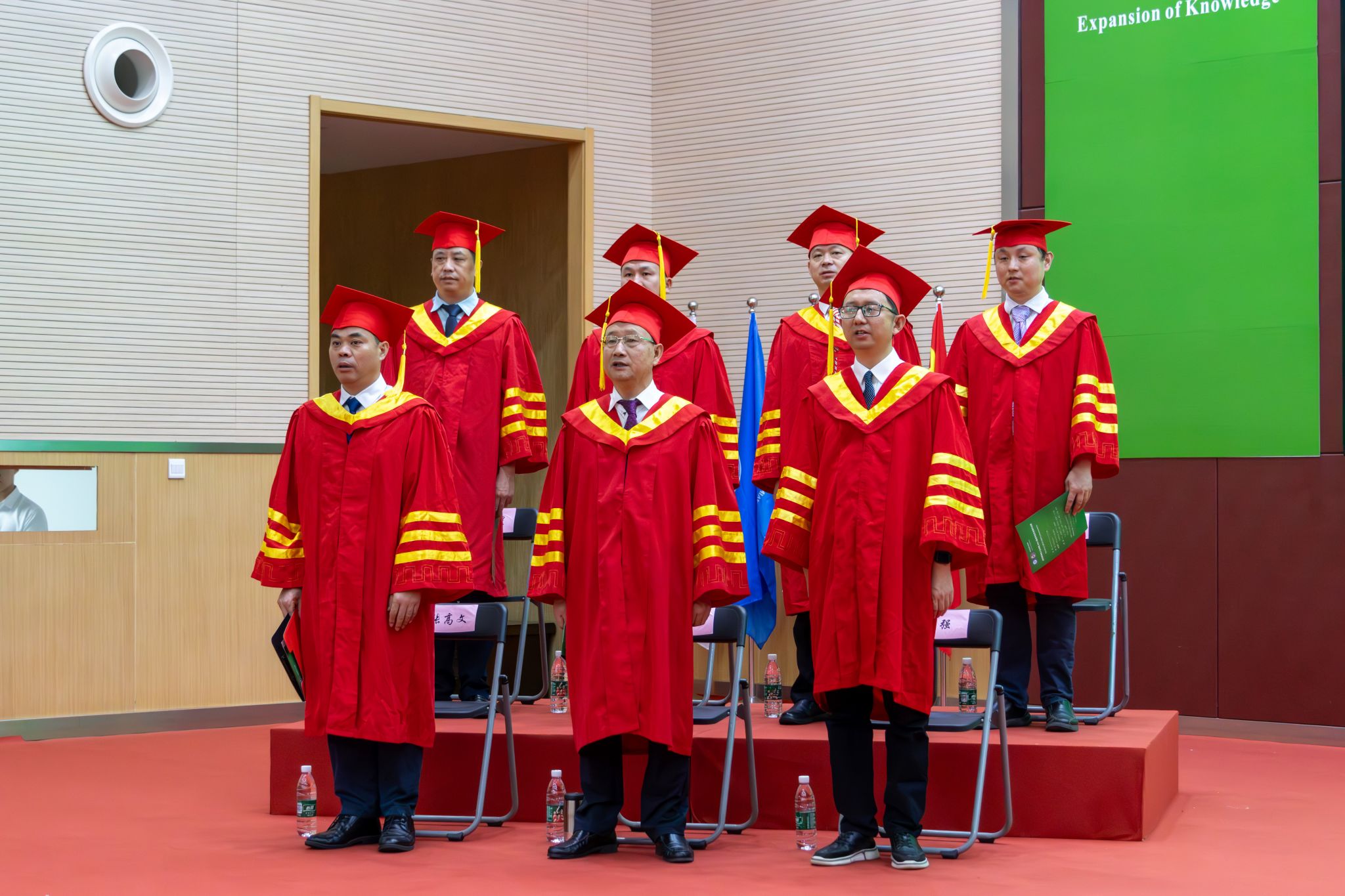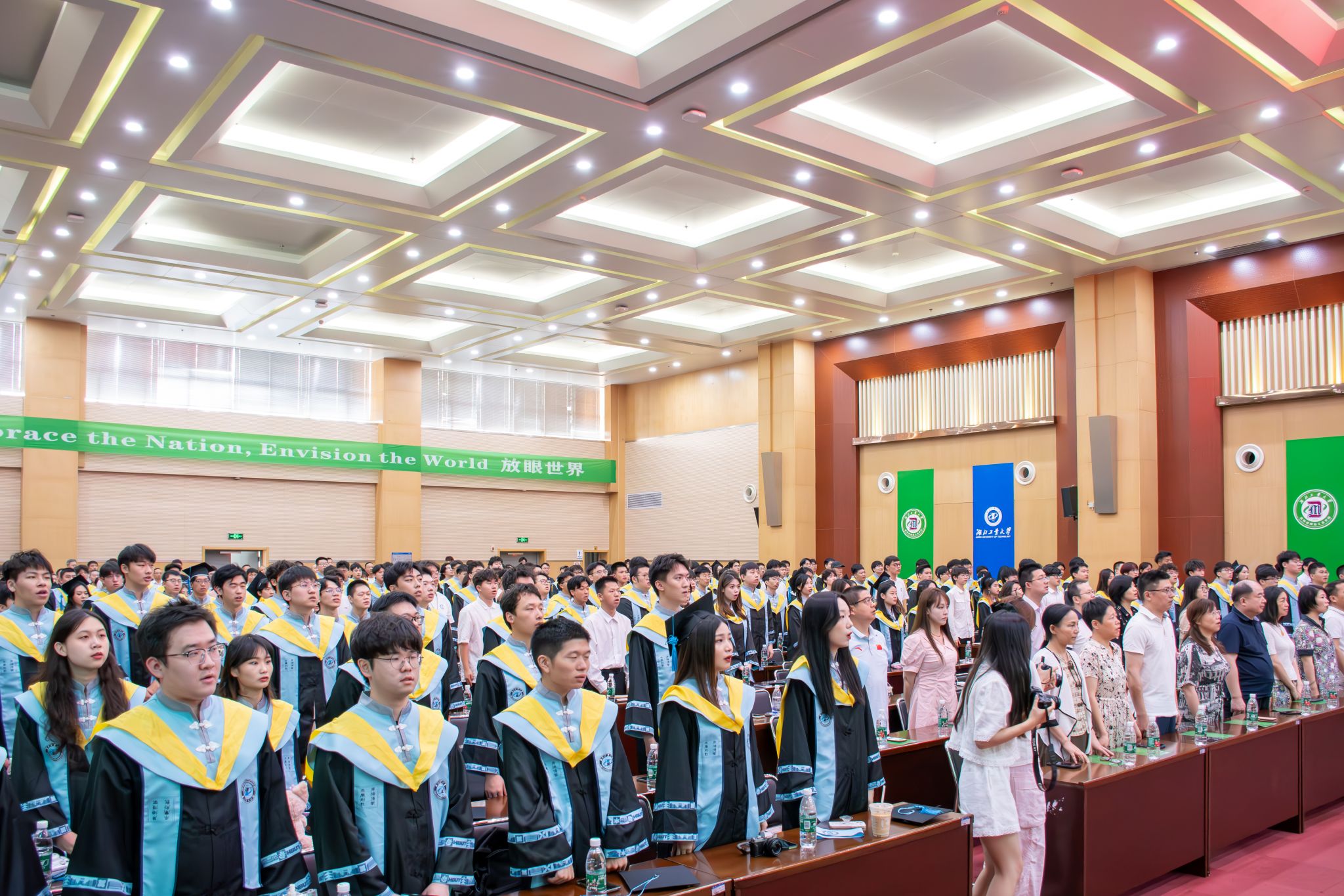会议伊始,全体起立,在庄严的国歌声中,毕业典礼拉开了序幕。