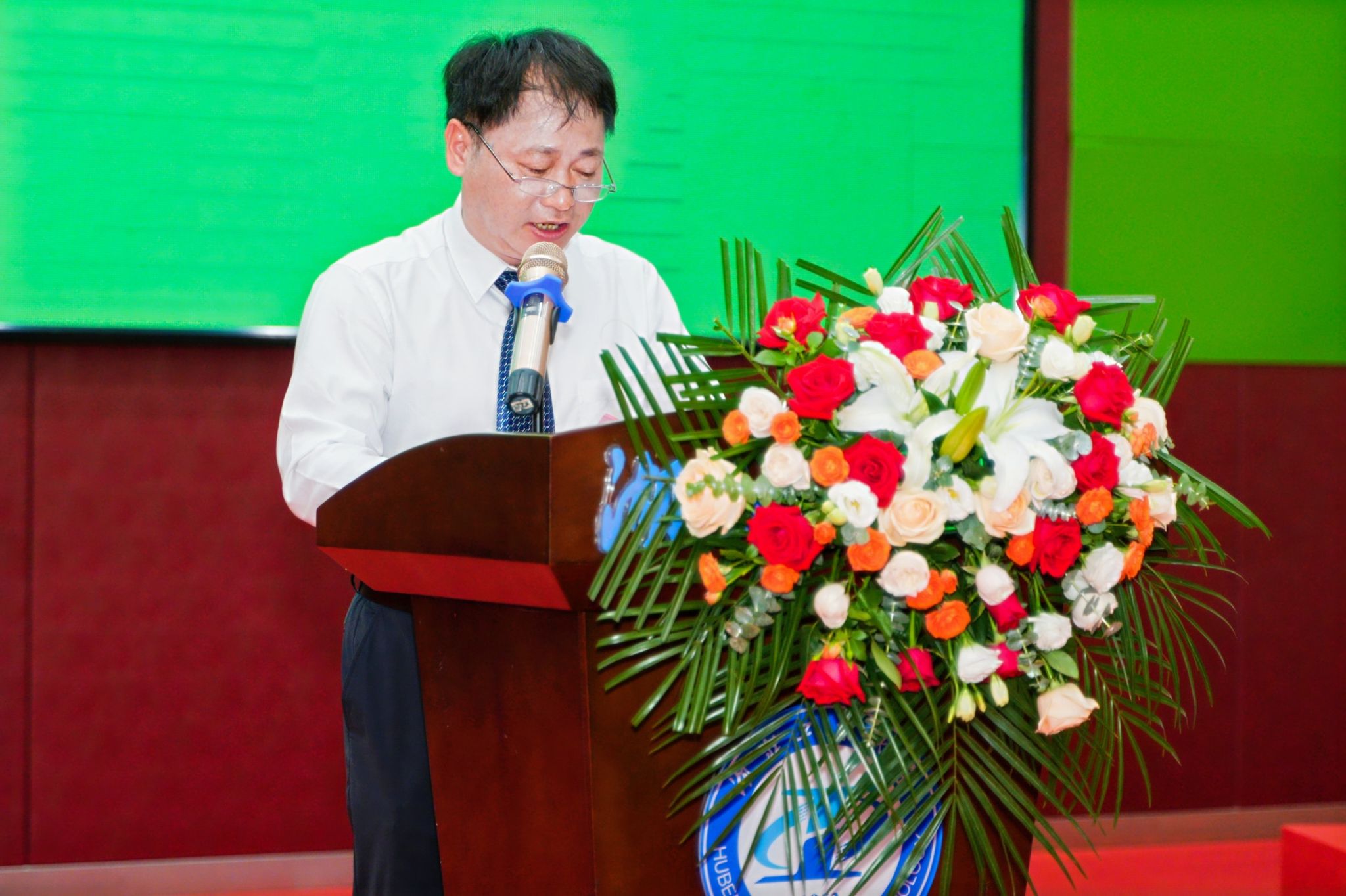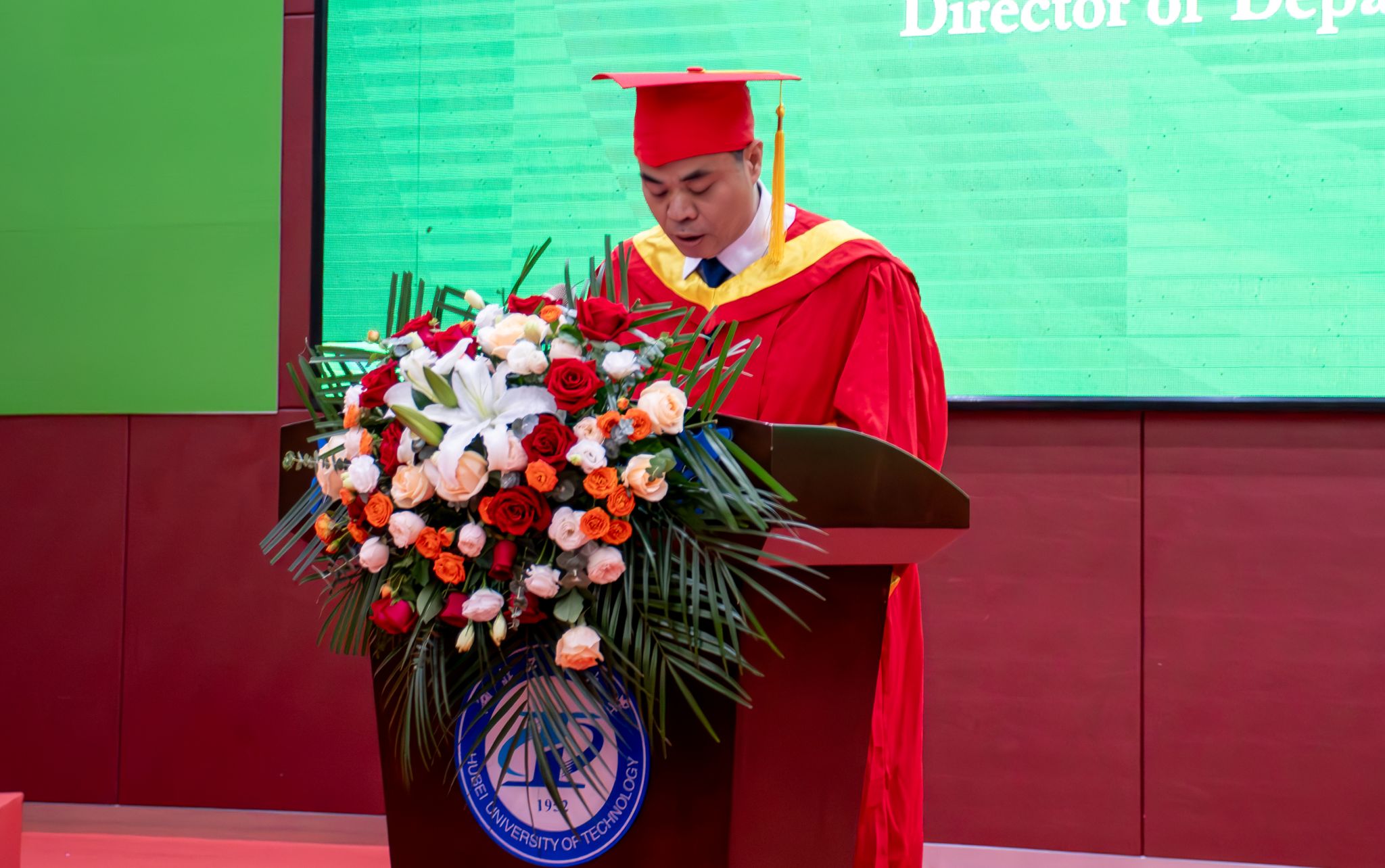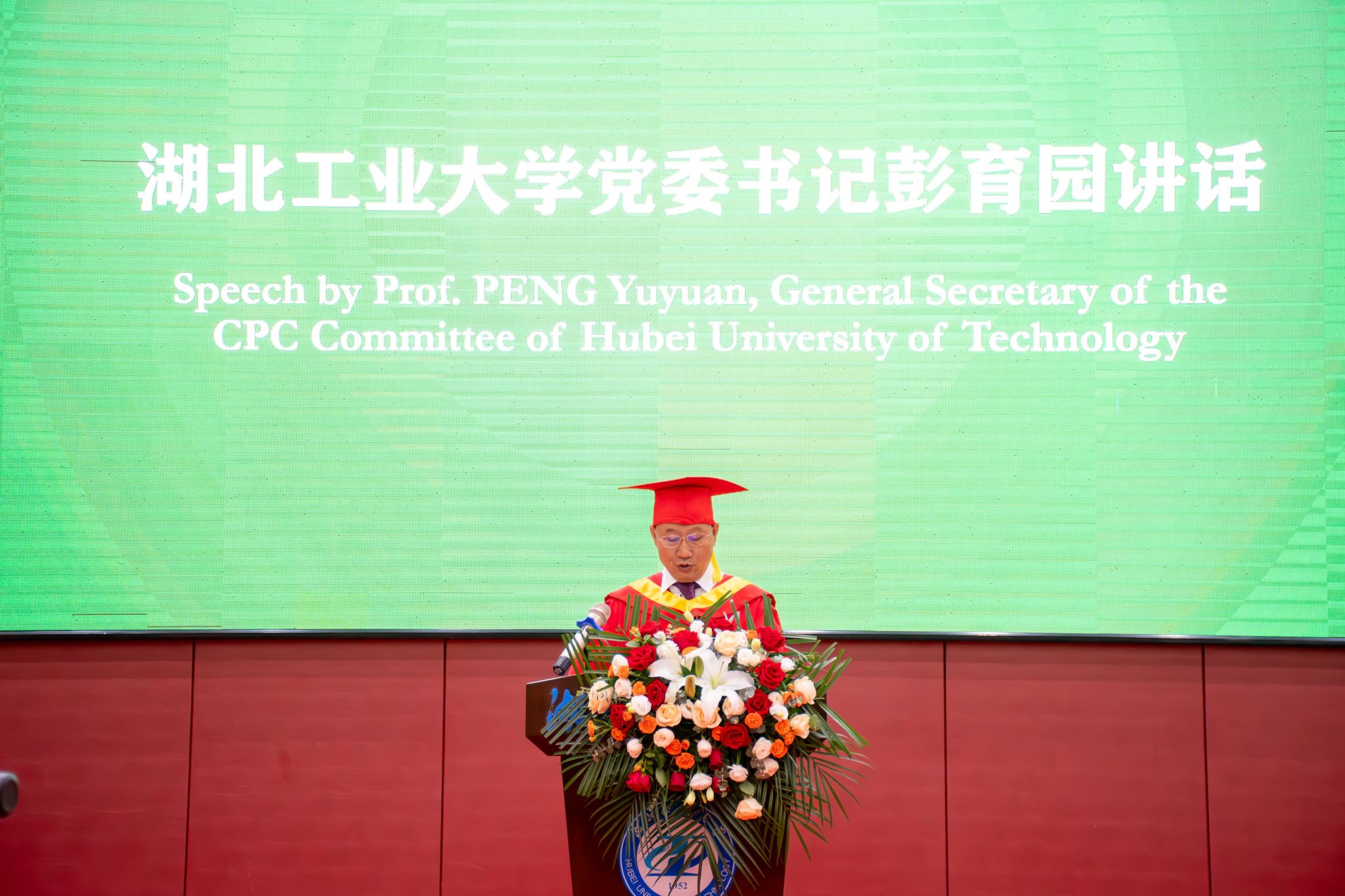 校党委书记彭育园教授对学院2024届毕业生表示祝贺,并肯定了学院四年来的人才培养成果。彭书记讲到,同学们作为湖北工业大学底特律绿色工业学院的首届学生,通过四年“在地国际化”的人才培养模式,涌现出了很多具有家国情怀和国际视野的优秀学子。彭书记希望所有同学都要做厚德博学的奉献者和求实创新的奋斗者,要以天下为己任,心怀家事国事天下事,树立为祖国为人民永久奋斗、赤诚奉献的坚定理想,把自己的小我融入祖国的大我、人民的大我之中,为实现中华民族伟大复兴的中国梦贡献湖工力量,将青春之花绽放在祖国和人民需要的地方。