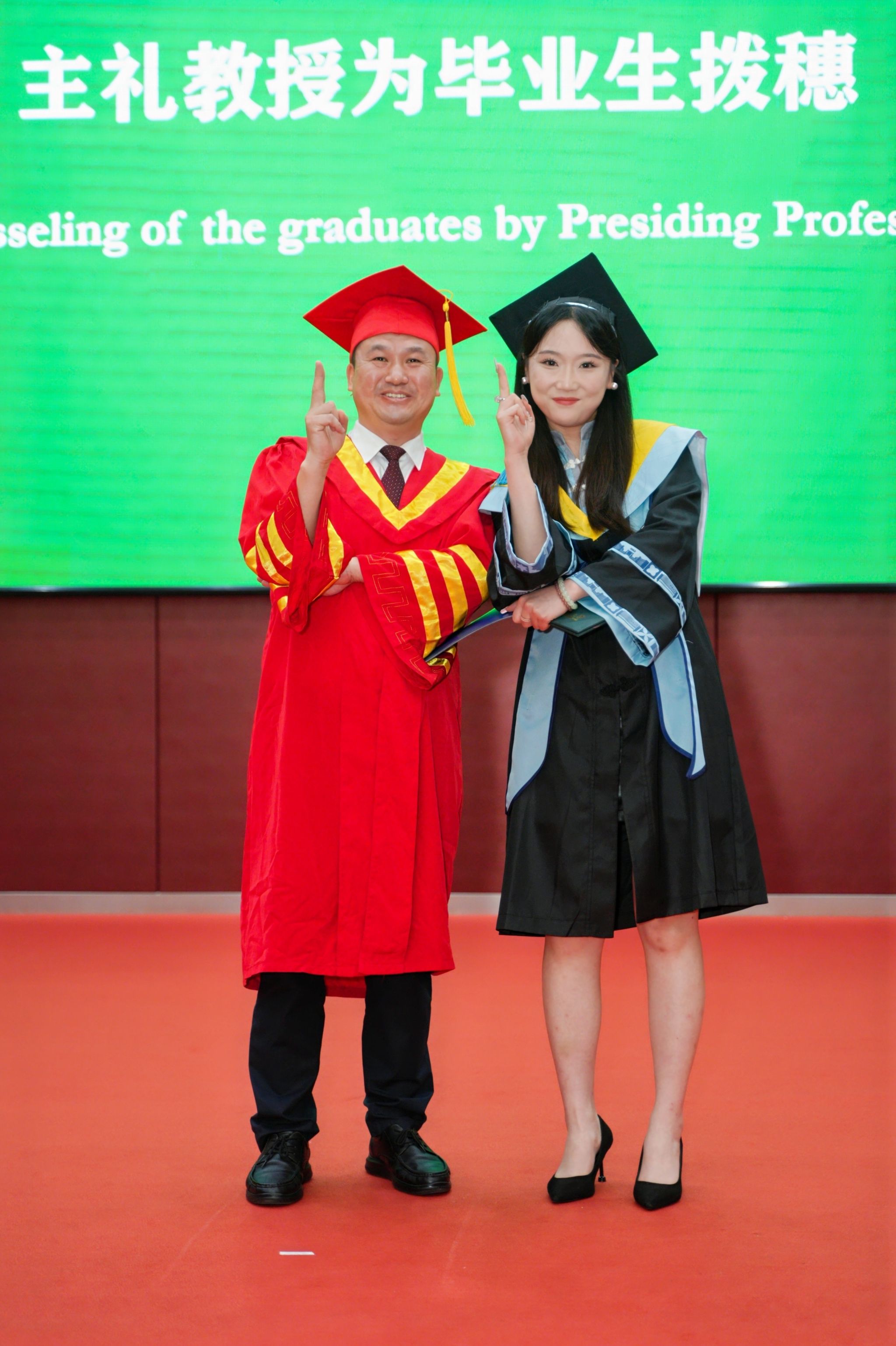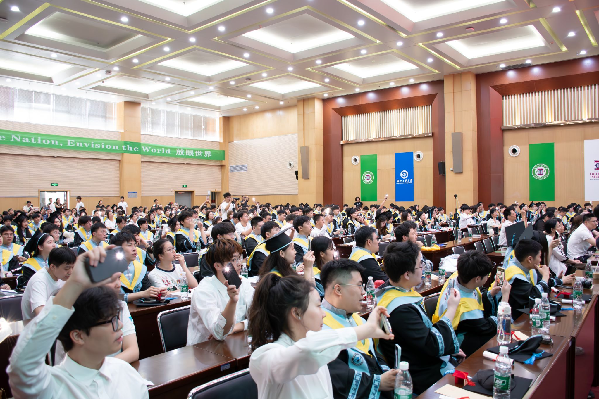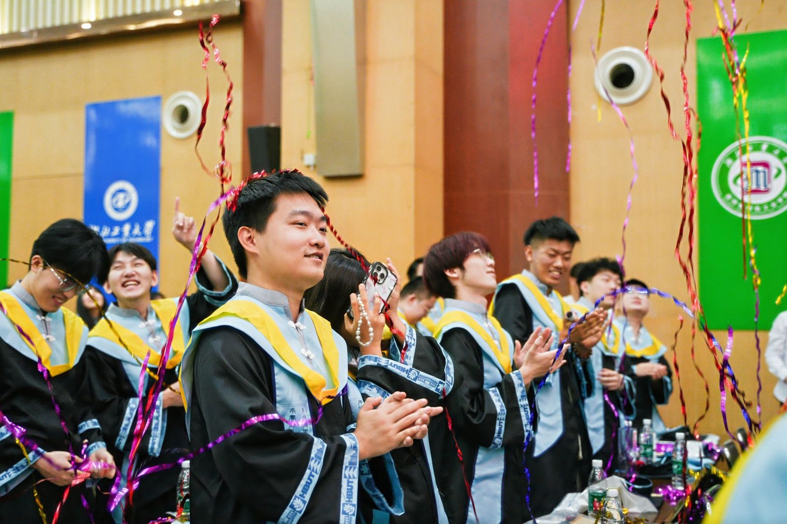 在激昂的乐声中,主礼教授——校党委书记彭育园、电气与电子工程学院院长张晓星、计算机学院院长叶志伟、土木建筑与环境学院院长肖衡林,分别为学院2024届毕业生逐一颁发学位证书并拨穗正冠。毕业生依次上台,接受学位证书并与主礼教授合影留念。