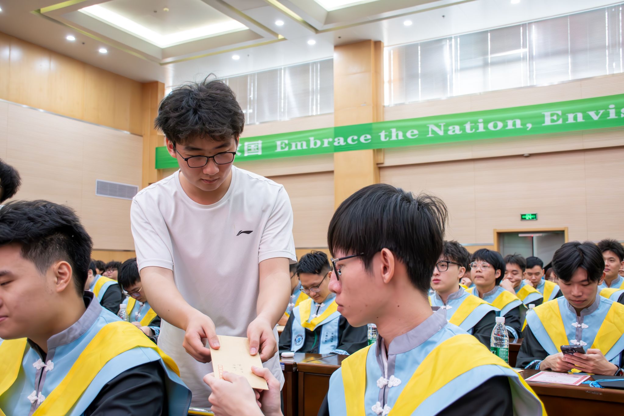 学院首任院长何涛教授和现任副院长马强教授为优秀毕业生代表赠送毕业纪念礼。学院为每位同学准备了一枚刻有学号、姓名的戒指和一件“十年之约”的文化衫,希望同学们铭记四年回忆,十年后大家能一起重回母校团聚,一起分享毕业十年的精彩人生。