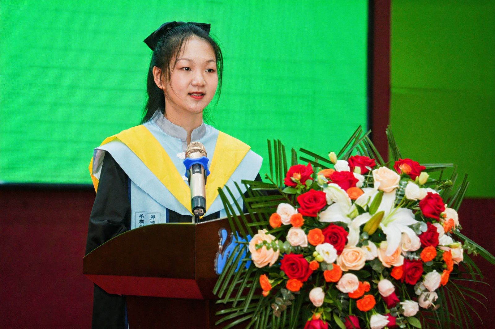 学院全体毕业生收到了来自四年前自己写下的一封信。20软件2班李褀雯同学作为学生代表,现场分享了四年前的信件,并作为毕业生代表发言。她回忆了自己四年来的成长历程,从学生会成立大会第一次拿起话筒主持,到即将作为研究生支教团成员前往新疆、站上讲台授课,改变的是身份,不变的是湖工大人“厚德博学 求实创新”的精神。