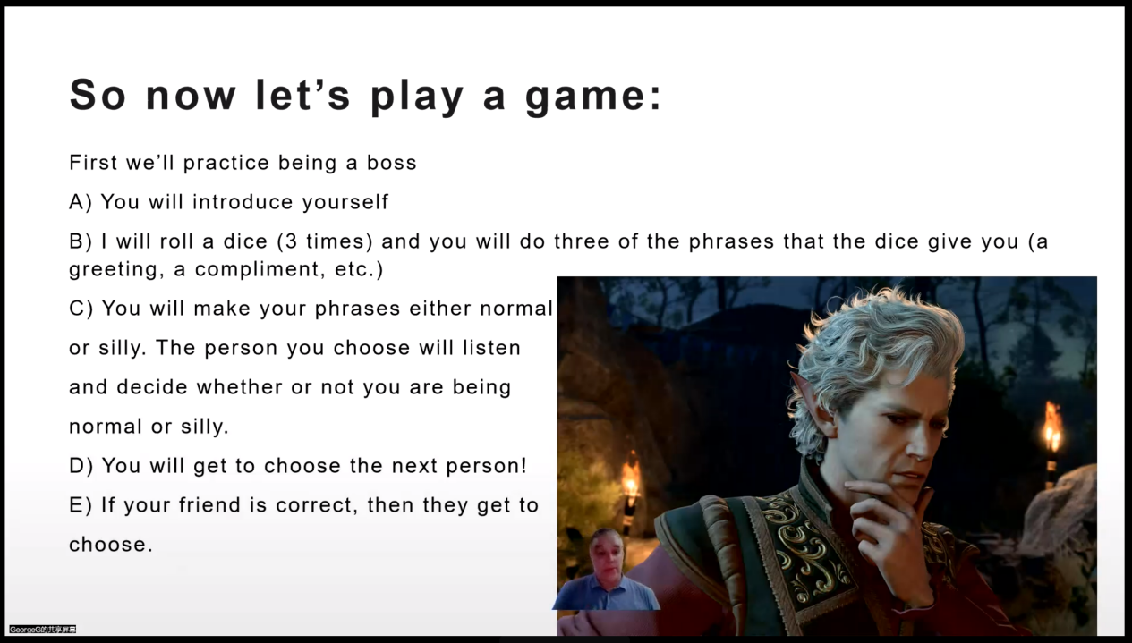 高中时期,英语课对于我一个英语比较弱的学生来说,是晦暗苦涩的,而幽默风趣的乔治先生用游戏对话这一独特的授课方式,让我们可以更加轻松愉快地理解学习内容,更是让我不再如此惧怕英语。英语网课的出现,在慌乱与不知所措之外,带给了我一些心安——正式开启大学生活前,一个月的英文课堂适应期,对我来说,真地非常友好。