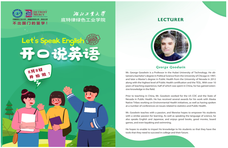 2023年8月8日,湖北工业大学底特律绿色工业学院为2023级准大一新生举办的“Let’s Speak English(开口说英语)”活动顺利开展。今年为学院连续举办这一活动的第四年,活动为期四周,每周五天,于新生开学前结束。学院特别邀请美国外教George Goodwin为本次活动主讲教师。