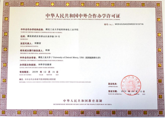 底特律绿色工业学院,是湖北工业大学设立的二级教学学院,也是湖北工业大学与美国底特律大学合作创建、经教育部正式批准设立的中外合作办学机构。开设有机械设计制造及其自动化、电气工程及其自动化、环境工程、软件工程四个全日制普通本科“4+0”中美合作办学专业。专业均为国家级一流本科专业建设点,均通过中国工程教育认证和美国ABET认证。学院融入中美双方先进教学理念,以培养具有国际视野、勇于参与国际竞争的高素质应用型人才为己任,使学生不出国门即可享受国际化人才培养。